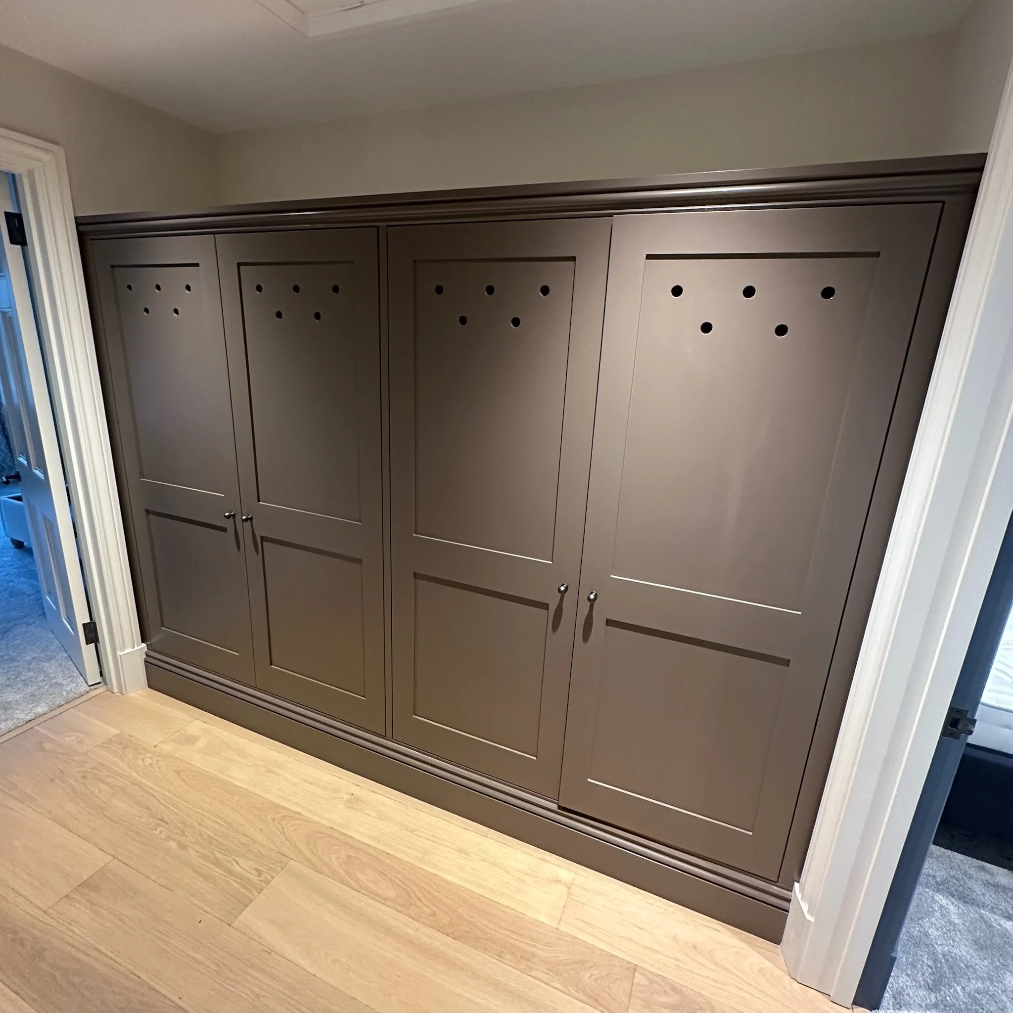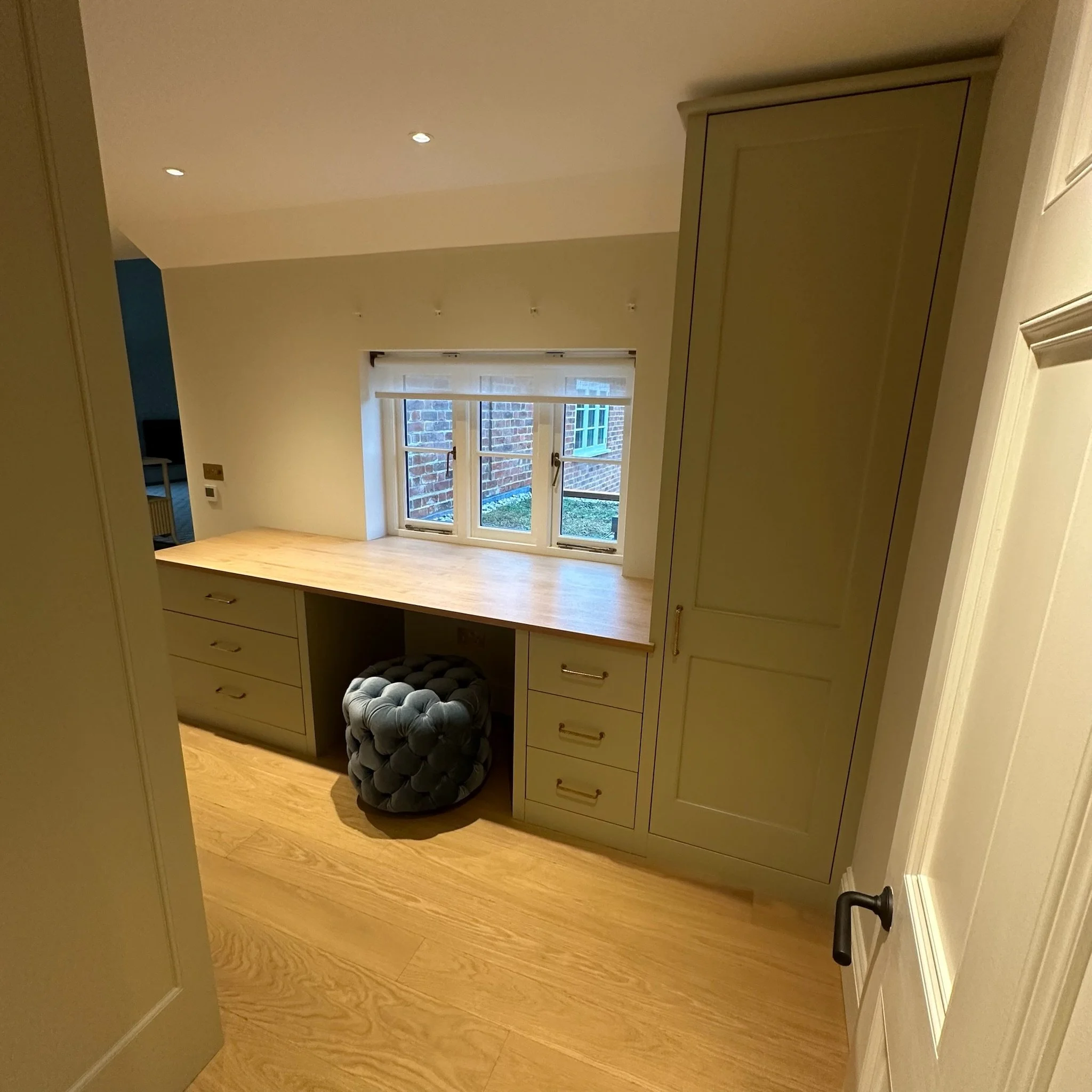 In this beautifully renovated farmhouse in Tadley, Hampshire, we were asked to create a range of bespoke furniture that would help shape the house into a practical and welcoming family home. Each space was designed to feel in keeping with the character of the property, combining classic design with thoughtful storage solutions that support busy family life. Throughout the home, our focus was on creating furniture that feels timeless, functional and carefully integrated into the architecture of the rooms.