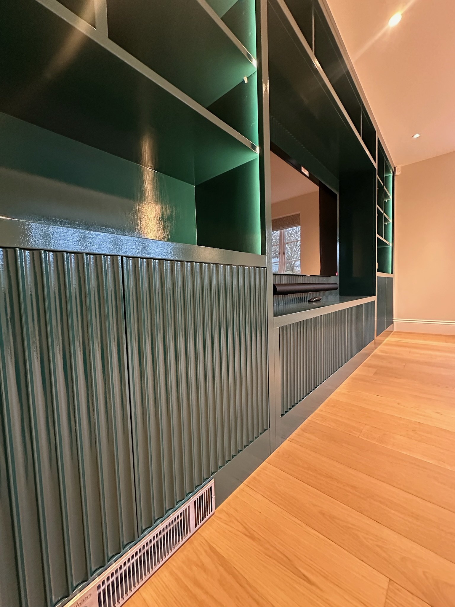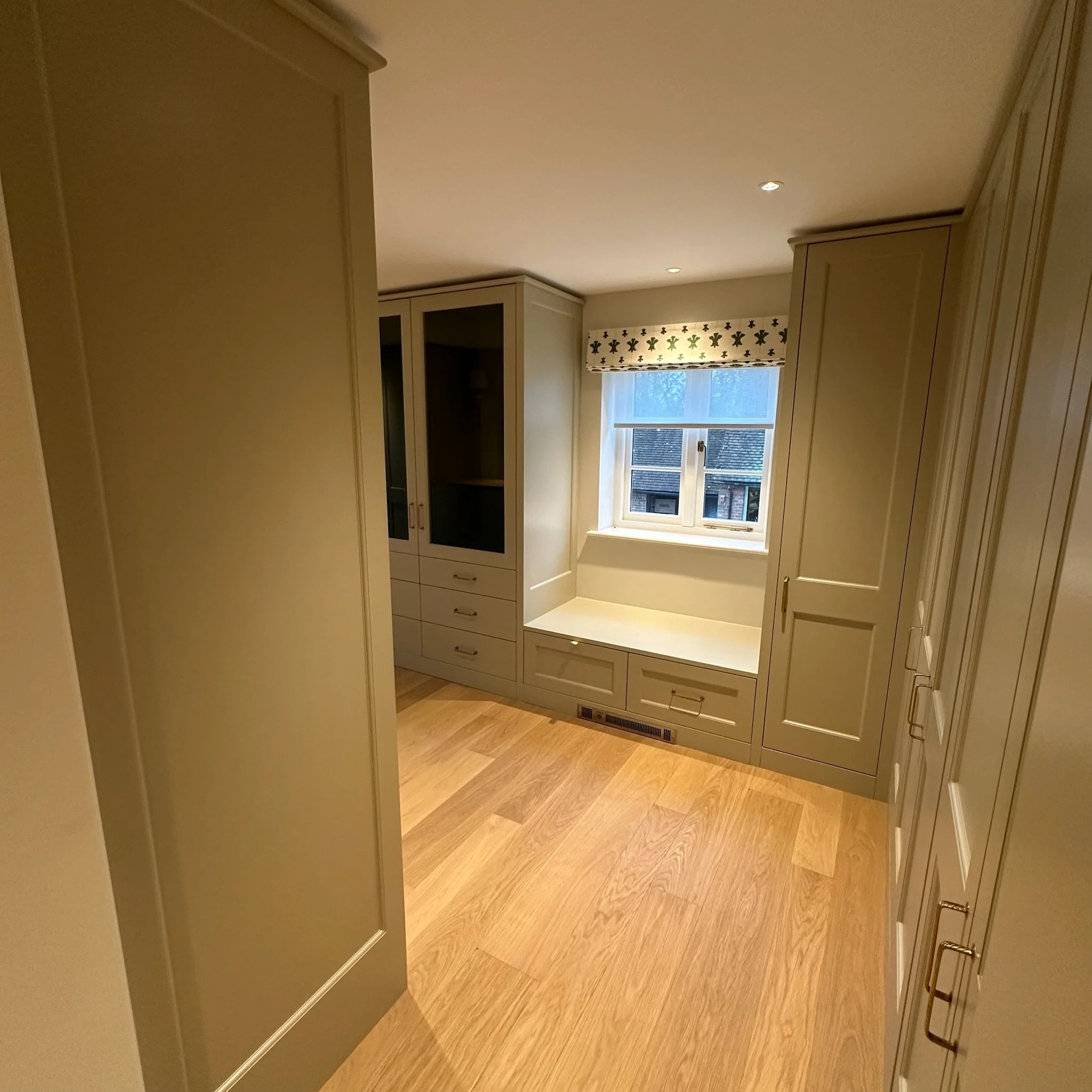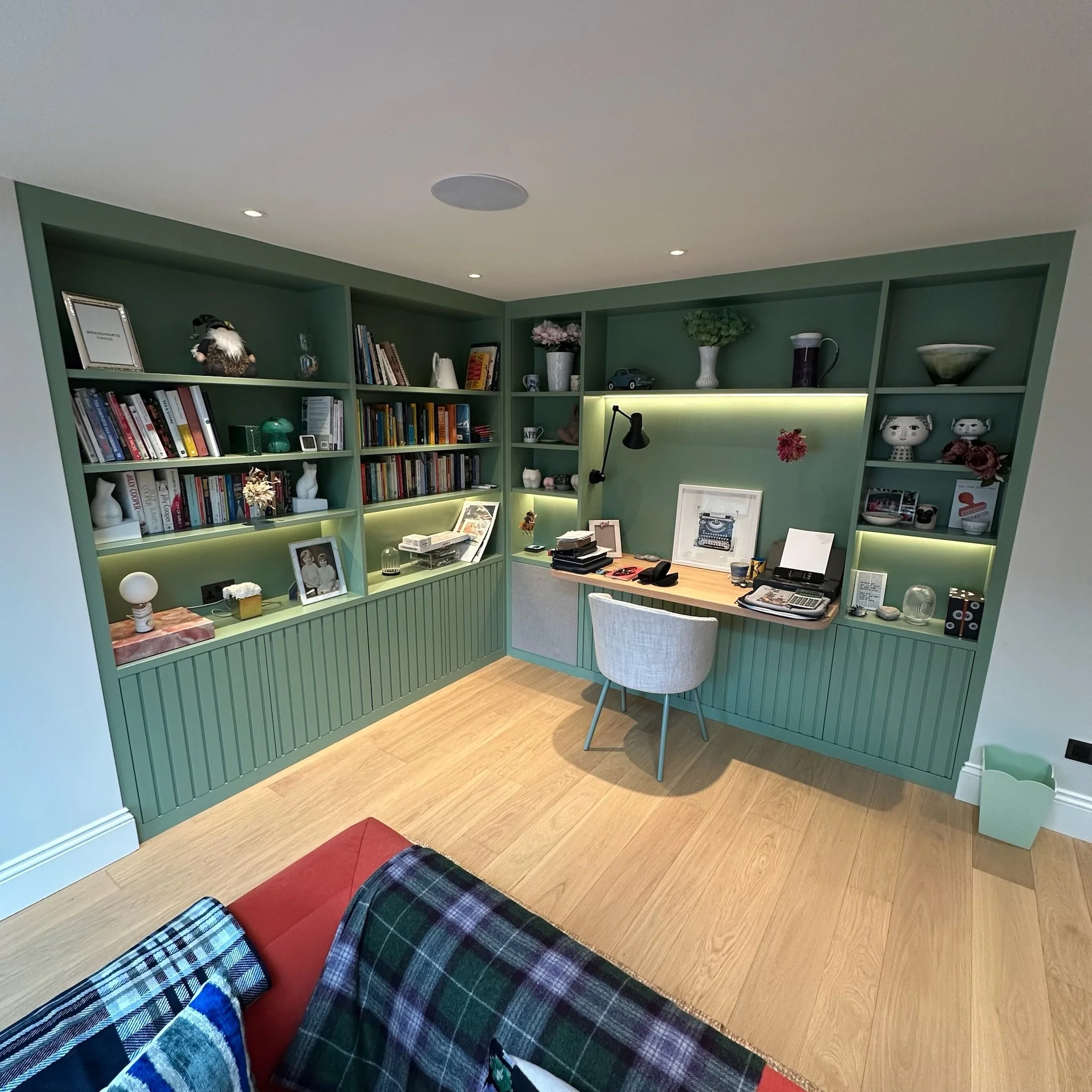 The principal suite features a calm and elegant dressing room with bespoke wardrobes and a dressing table, designed to provide organised storage while creating a refined space to start and end the day. In the children’s bedrooms, fitted wardrobes offer practical storage designed to grow with the family, while a large traditional-style airing cupboard provides generous and well-organised linen storage. Elsewhere in the home, we created a family room complete with a desk area and extensive book shelving, offering a comfortable space for work, reading and relaxing. The playroom was designed with a more playful character, incorporating a media centre that keeps entertainment organised while maintaining a classic and practical look that will continue to work for the family as the children grow.