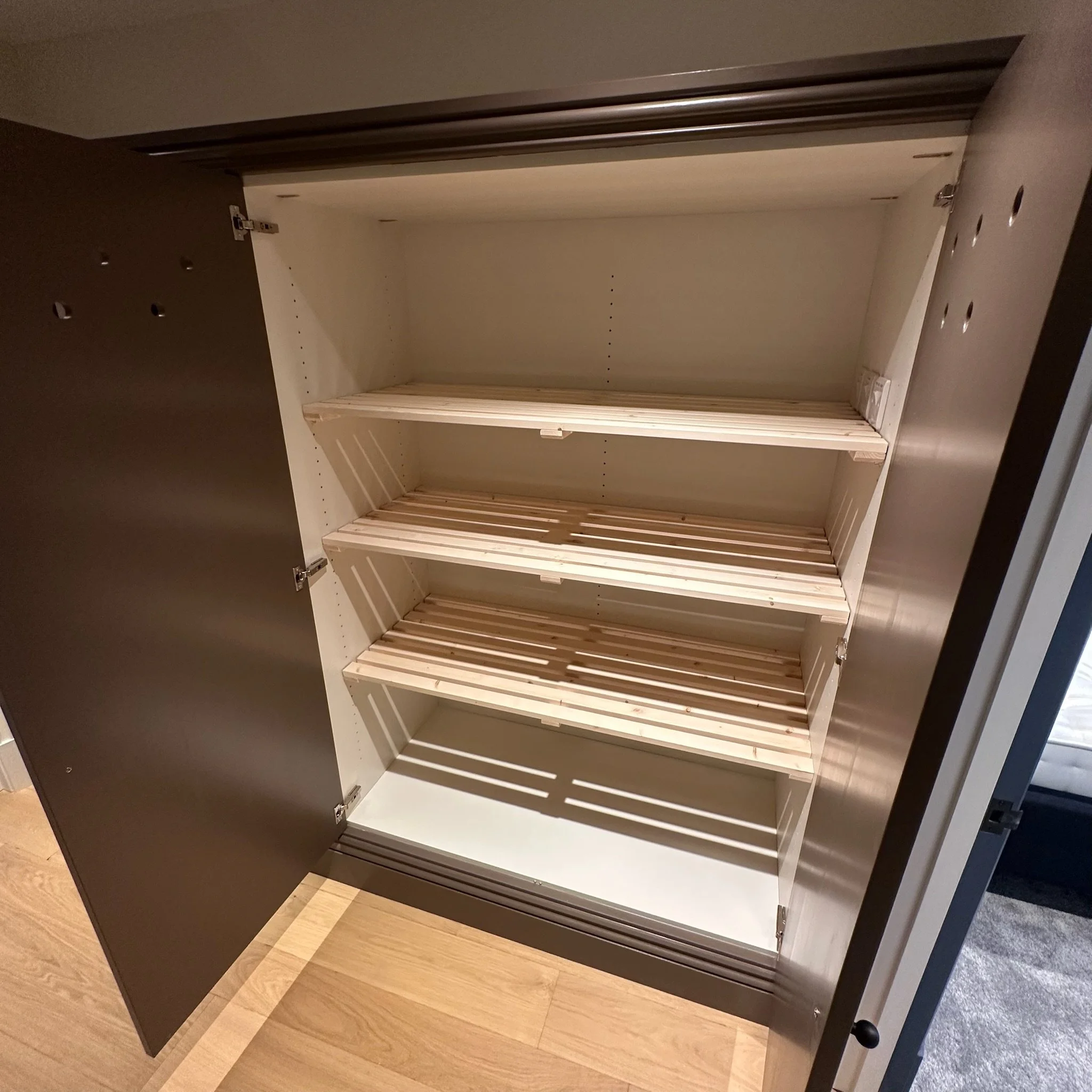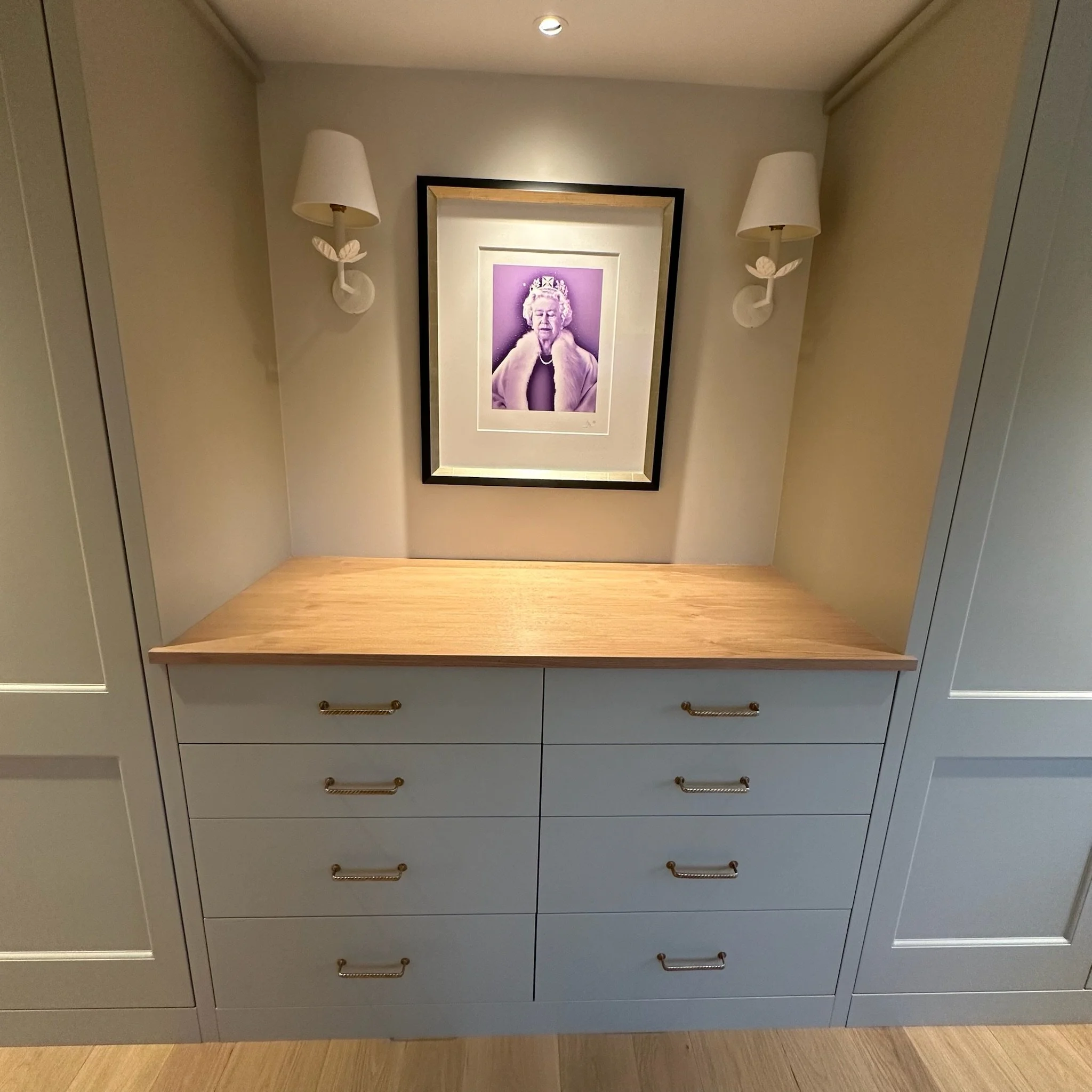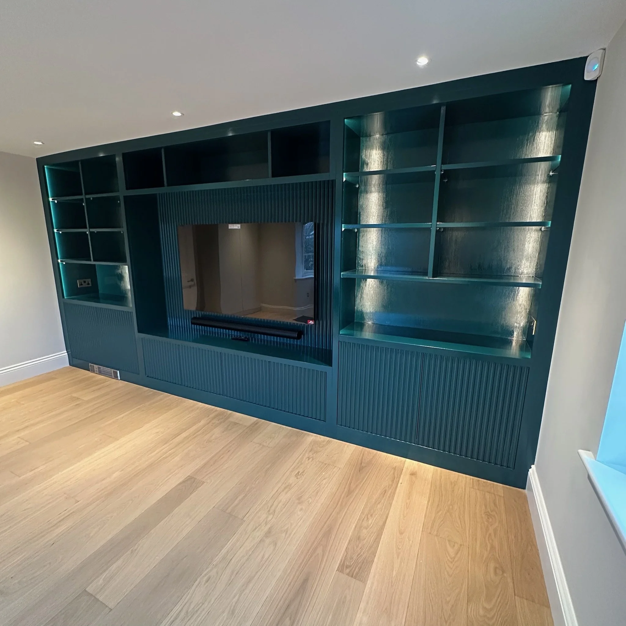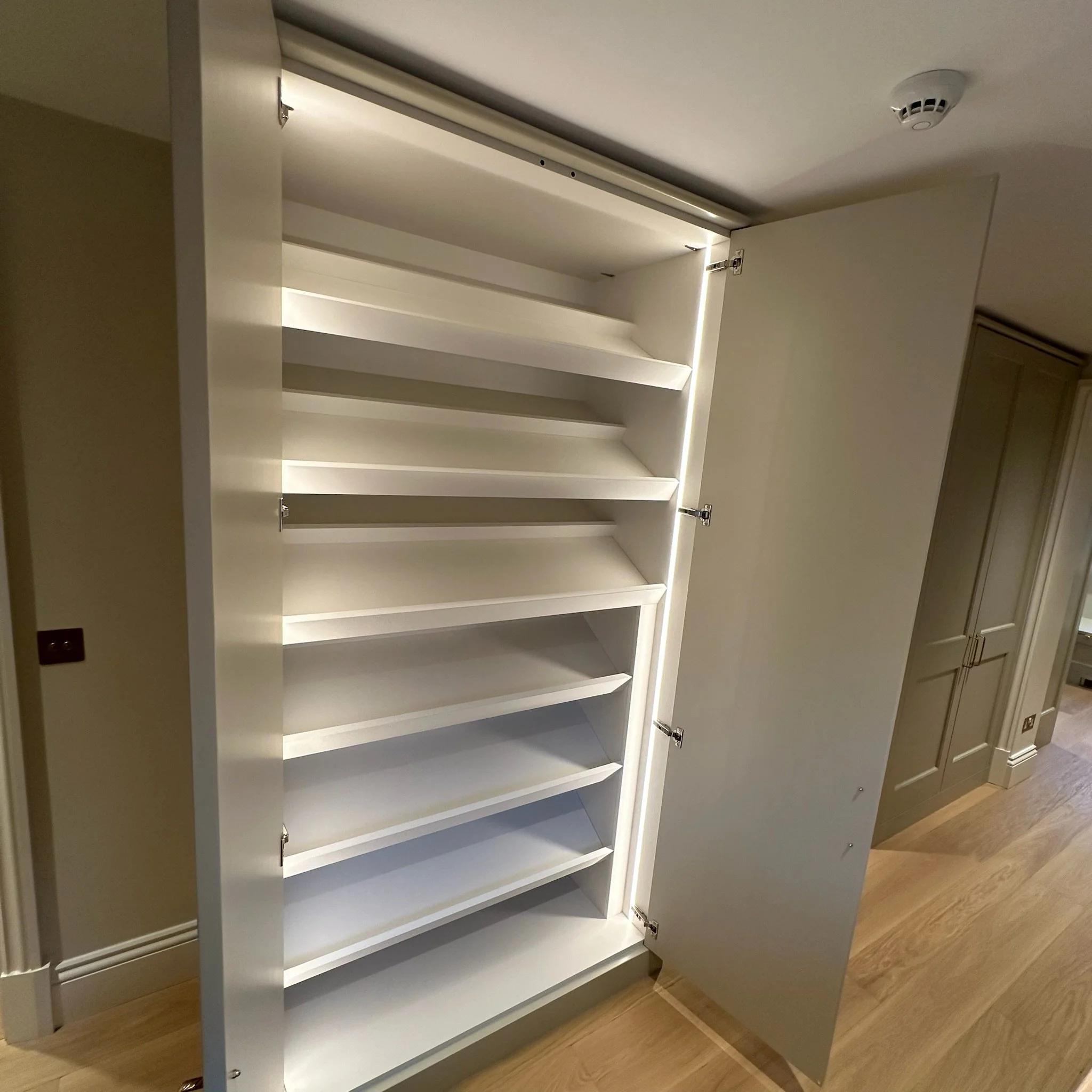 The principal suite features a calm and elegant dressing room with bespoke wardrobes and a dressing table, designed to provide organised storage while creating a refined space to start and end the day. In the children’s bedrooms, fitted wardrobes offer practical storage designed to grow with the family, while a large traditional-style airing cupboard provides generous and well-organised linen storage. Elsewhere in the home, we created a family room complete with a desk area and extensive book shelving, offering a comfortable space for work, reading and relaxing. The playroom was designed with a more playful character, incorporating a media centre that keeps entertainment organised while maintaining a classic and practical look that will continue to work for the family as the children grow.