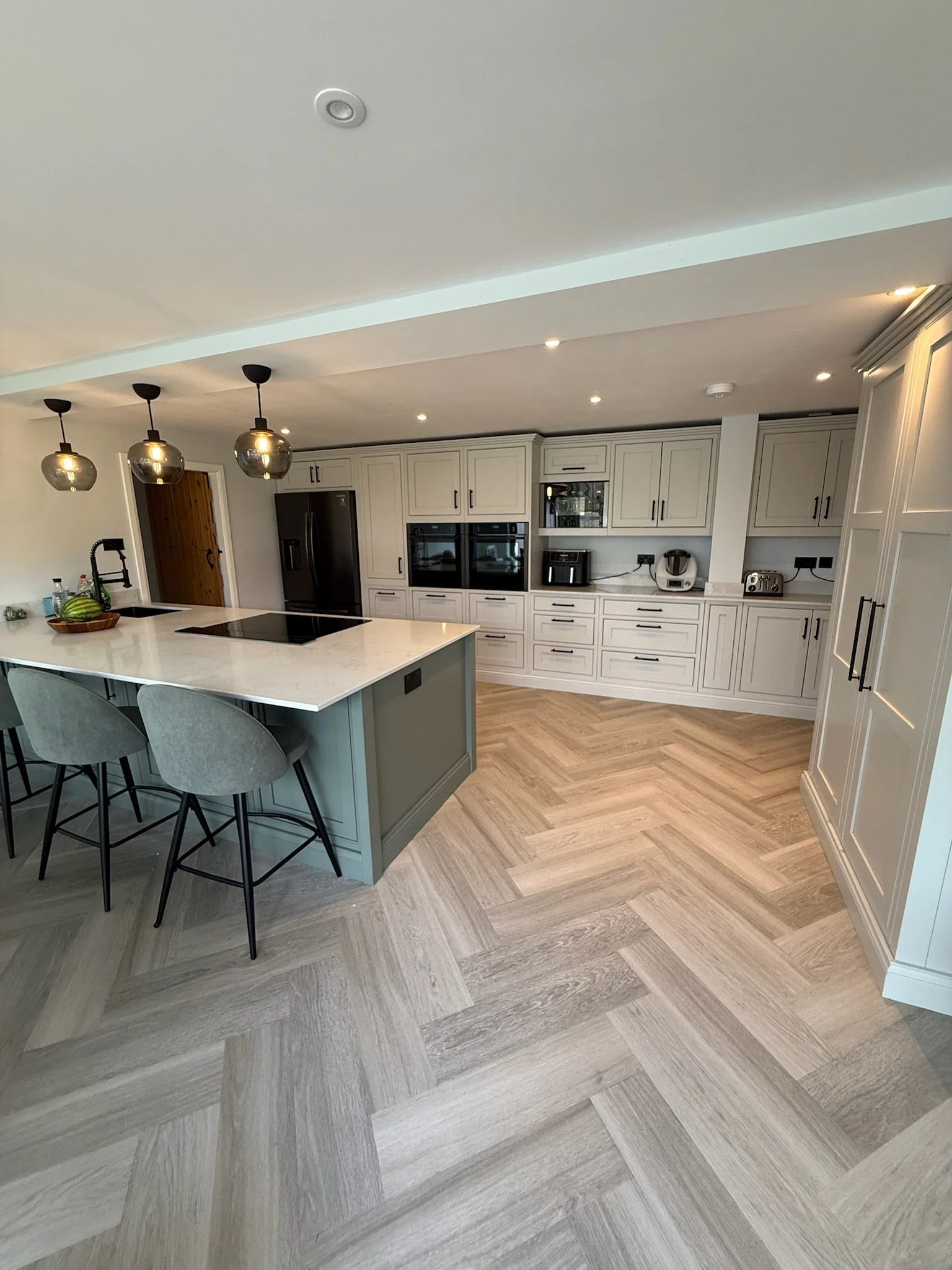 This kitchen was created as part of a new extension to a family home, designed to form a spacious and welcoming heart of the house. The cabinetry features a classic in-frame design, finished in a rich Regiment Green paired with soft Dove Grey, giving the space a timeless and elegant character. The traditional style works beautifully with the architecture of the extension while still feeling practical and comfortable for everyday family life.