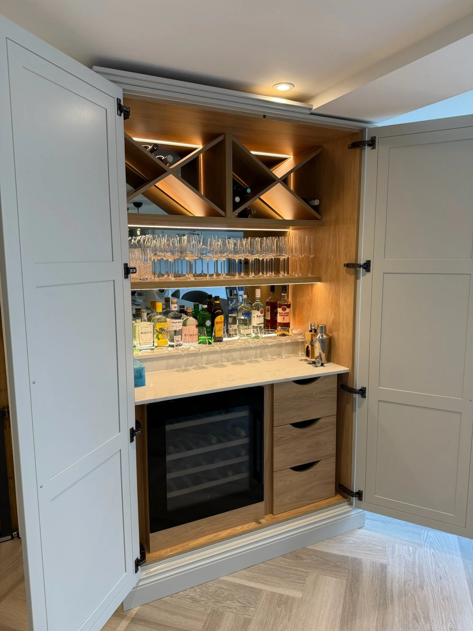 Our client wanted the kitchen to function not only as a place for cooking and dining but also as a space for entertaining friends and family. To achieve this, we incorporated a dedicated drinks cabinet complete with an integrated wine fridge, creating a stylish and practical area for serving drinks. This feature adds a sociable element to the room, allowing the kitchen to transition effortlessly from a busy family space during the day to an inviting setting for hosting in the evening.
